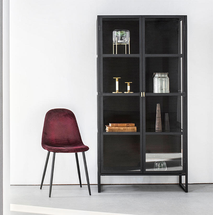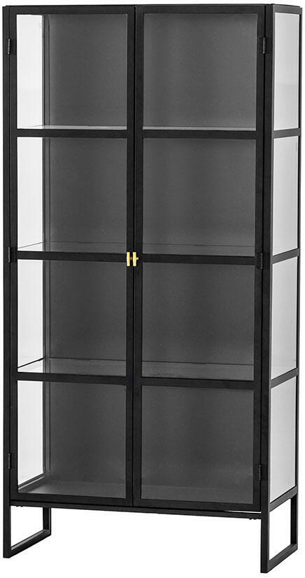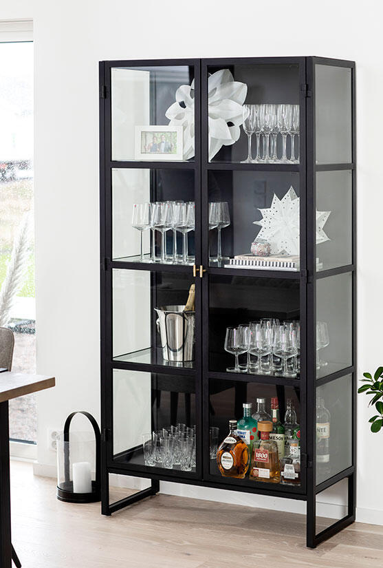 Indy från Torkelson har en stilren formgivning, tillverkad helt i metall med sidor och hyllplan av glas. Det moderna förvaringsskåpet har en fin svartlackad finish med en elegant detalj i form av det nätta handtaget av mässing. Vitrinskåpet Indy finns i två storlek; med en eller två dörrar. Det här är den större modellen, den mindre hittas en bit ner på sidan under Liknande produkter.