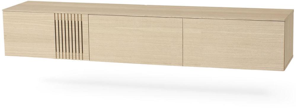 Joel har totalt tre stycken luckor där ena har fina ribbor som förgyller designen. Bakom varje dörr finns ett hyllplan. TV-bänken levereras med ben som du själv väljer om du vill använda, bänken kan nämligen både ställas på golvet med benen såväl som hängas på väggen. Väljer du att hänga mediabänken på väggen får du ett något luftigare intryck. Joel bänk 180 cm är tillverkad av fanerad ek med en ytbehandling av svartbets med ett ytskikt av mattlack alternativt rökolja eller vitolja.