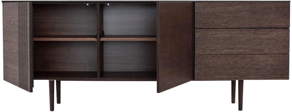 Skänken Joel har två dörrar och tre lådor. Bakom varje dörr finns ett trähyllplan som kan justeras efter önskemål. Dörrar och lådor har praktisk och tystlåten push-to-open funktion.