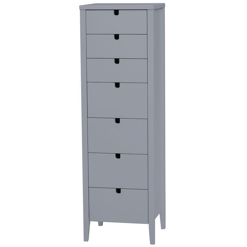 Klinte är en nätt, smal och snygg byrå med 7 lådor i grå- eller vitlackad MDF med lådsidor i plywood. Klinte har smidiga och läckra urfrästa handtag som bidrar till den enkla och snygga designen. Byrån är lättplacerad och passar lika bra i hall som på kontor, sovrum och badrum. Klinte byrå finns både i smala och breda utföranden och med olika antal lådor.