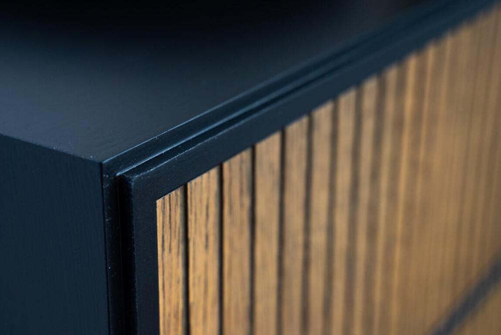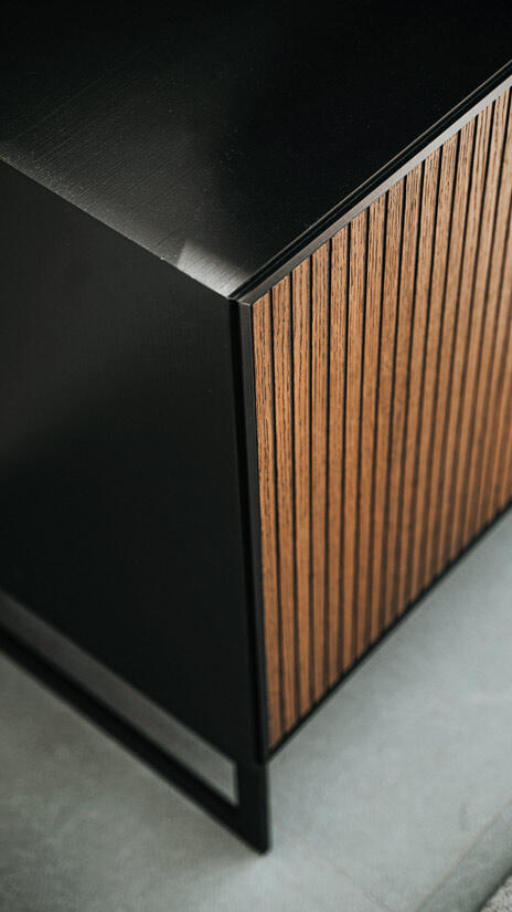 Line finns nu även i utförandet Burned Walnut - fronter i valnötsbetsad ekfanér med sidor i svart eller vit. Överdelen ackompanjeras med benställning eller sockel.