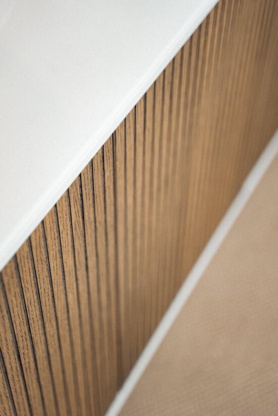 Line finns nu även i utförandet Burned Walnut - fronter i valnötsbetsad ekfanér med sidor i svart eller vit. Överdelen ackompanjeras med benställning eller sockel.