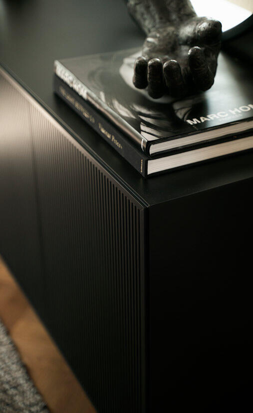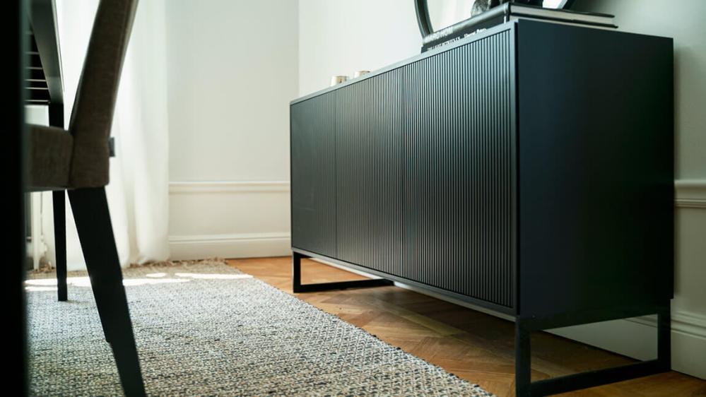 Line finns nu även i utförandet Burned Walnut - fronter i valnötsbetsad ekfanér med sidor i svart eller vit. Överdelen ackompanjeras med benställning eller sockel.