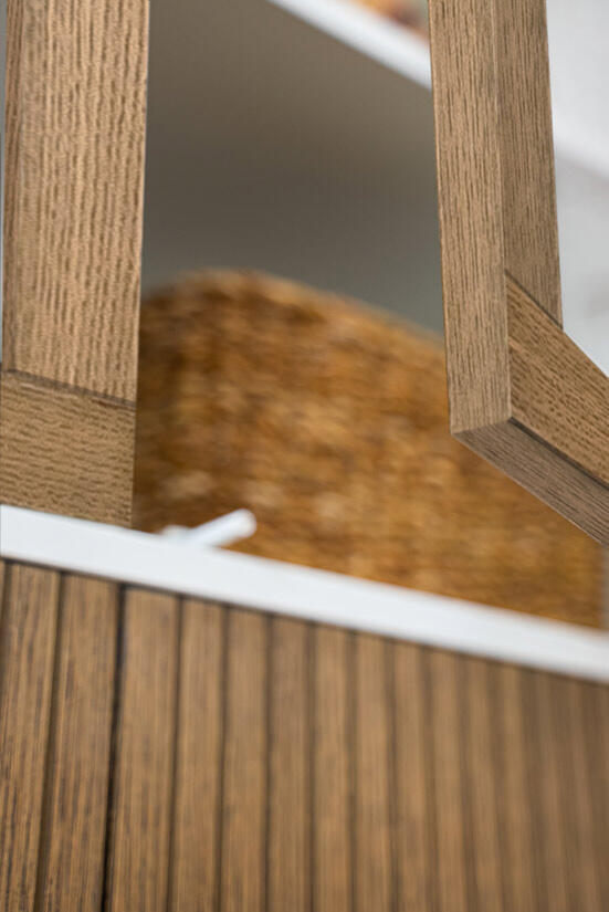 Line finns nu även i utförandet Burned Walnut - fronter i valnötsbetsad ekfanér med sidor i svart eller vit. Överdelen ackompanjeras med benställning eller sockel.