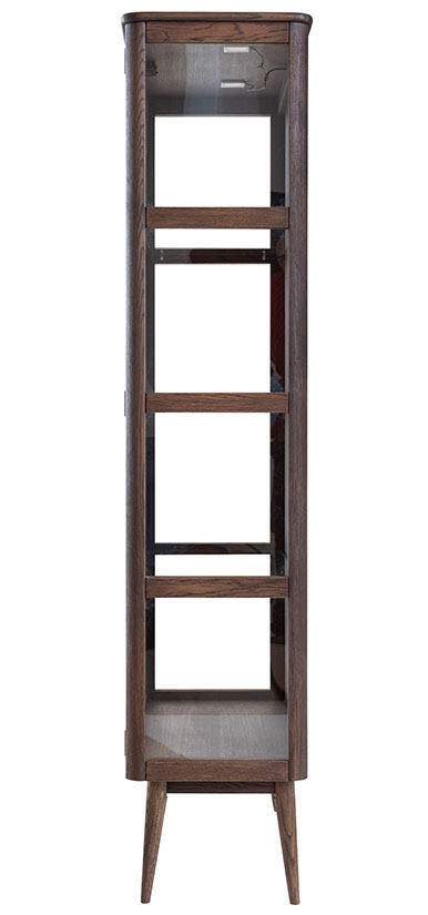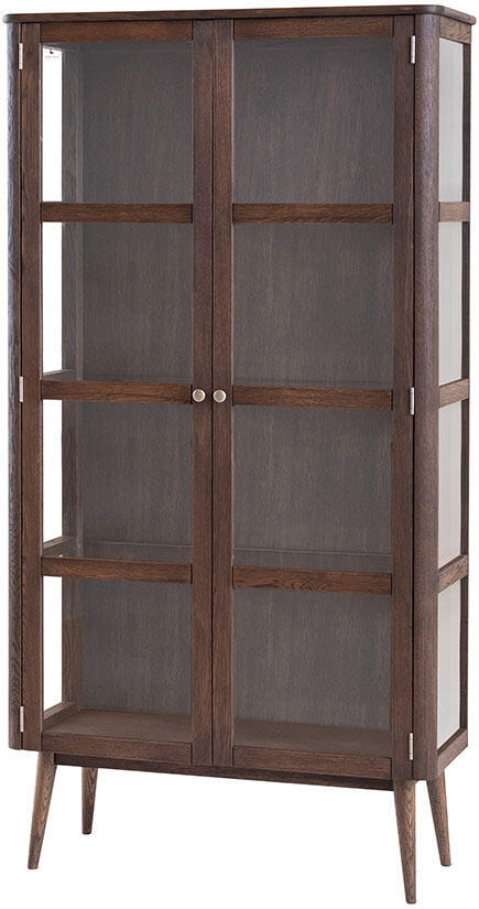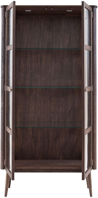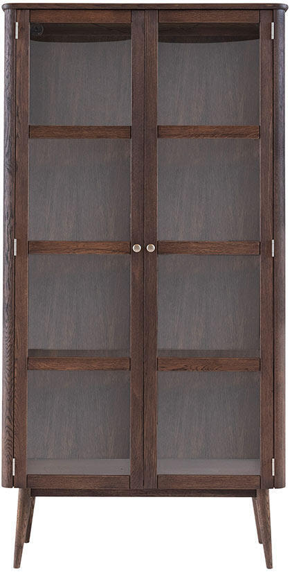 Förvaringsskåpet har två vitrindörrar med sidor av glas samt tre fasta glashyllplan som ger möjlighet till bra förvaring. Tillverkad i en kombination av fanérad och massiv ek med en vacker rökoljad ytbehandling.
