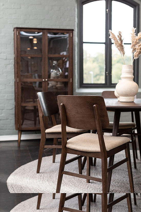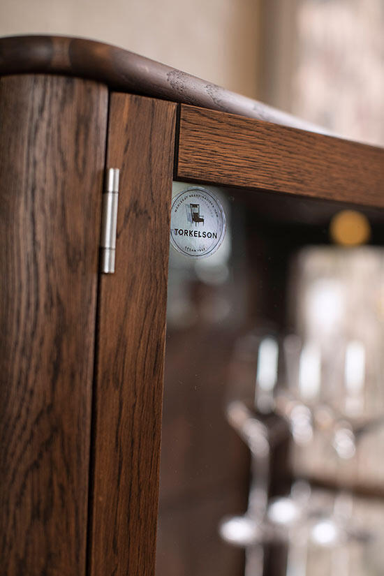 Vitrinskåp Löderup har flera smakfulla detaljer så som runda hörn, rundad kant på toppskiva, svarvade ben, stilrena handtag och synliga gångjärn som bidrar till helheten. Skåpet har dessutom integrerade belysning som sprider ett stämningsfullt ljus, belysningen lyfter även fram de saker som placerats i skåpet på ett fint sätt.