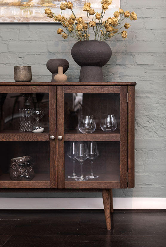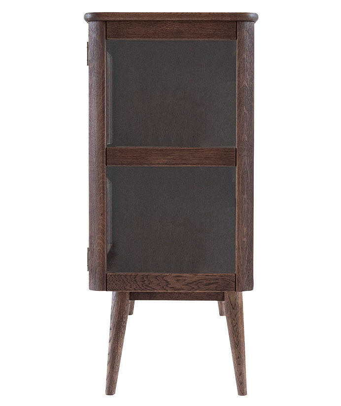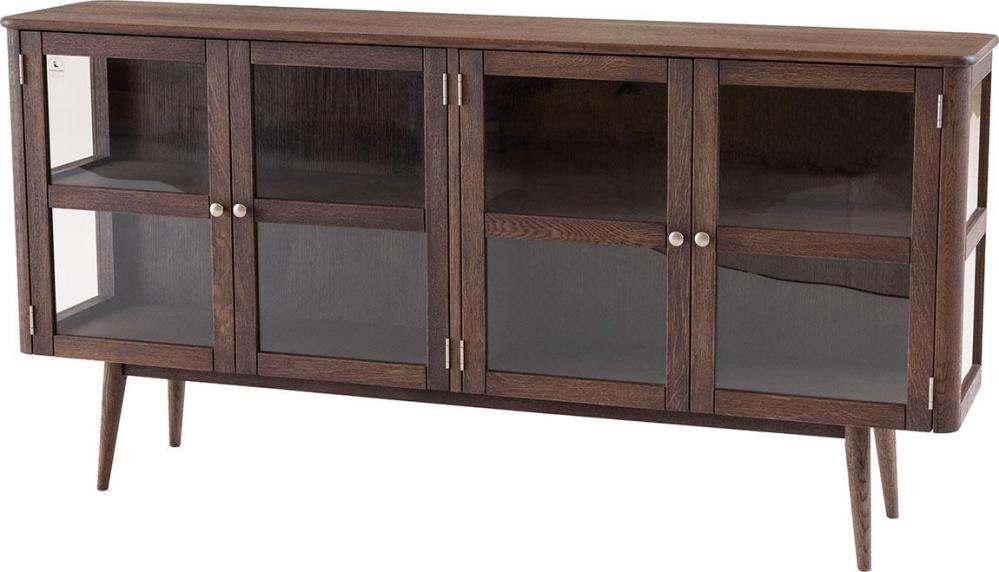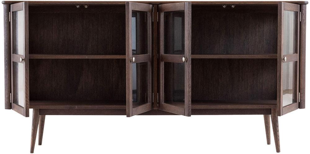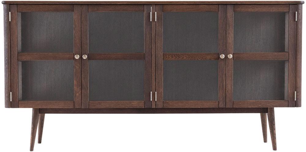 Vitrinbuffén har två par vitrindörrar med sidor av glas samt ett trähyllplan bakom varje dörrpar som ger möjlighet till bra förvaring. Tillverkad i en kombination av fanérad och massiv ek med en vacker rökoljad ytbehandling.