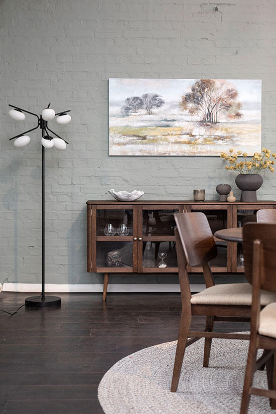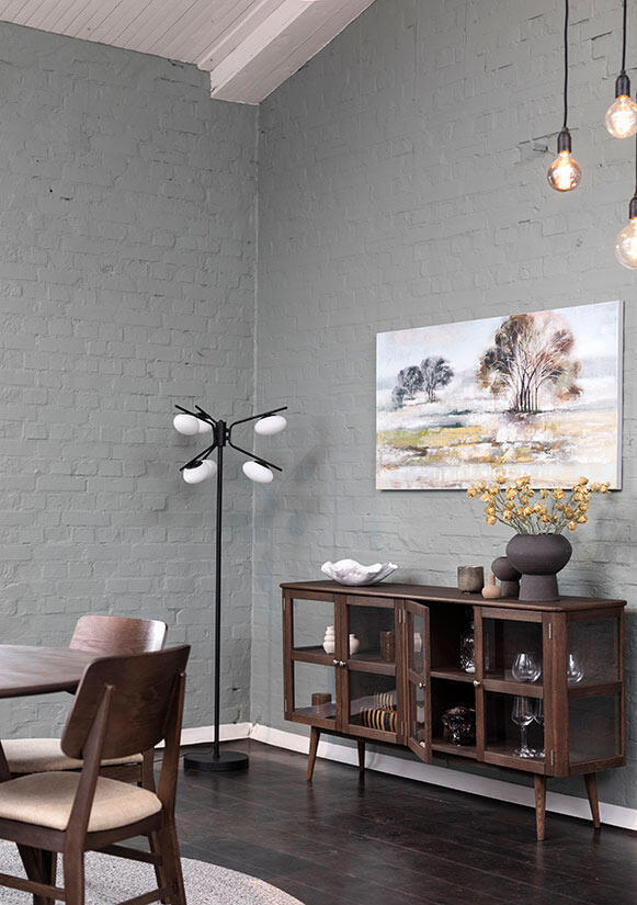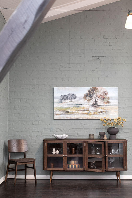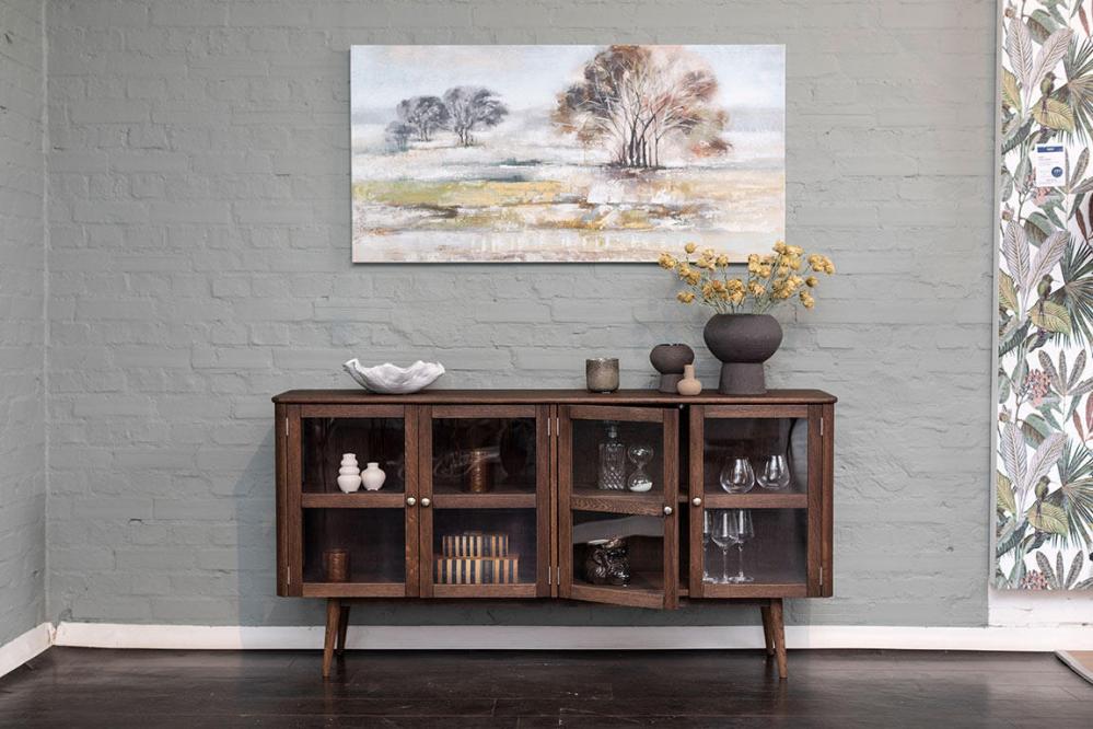 Sideboard Löderup har flera smakfulla detaljer så som runda hörn, rundad kant på toppskiva, svarvade ben, stilrena handtag och synliga gångjärn som bidrar till helheten.