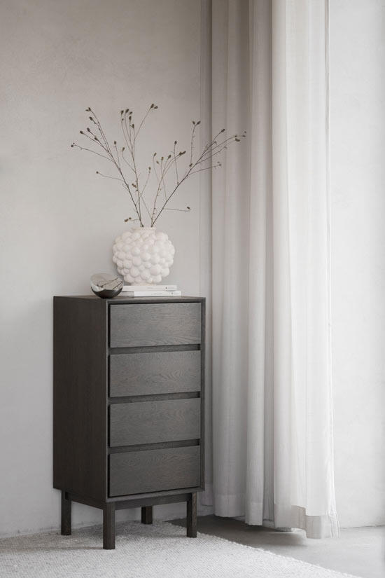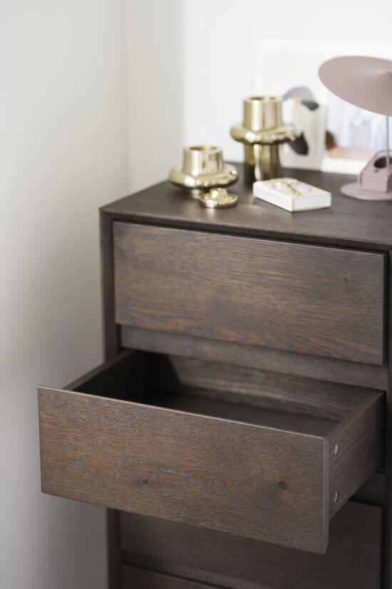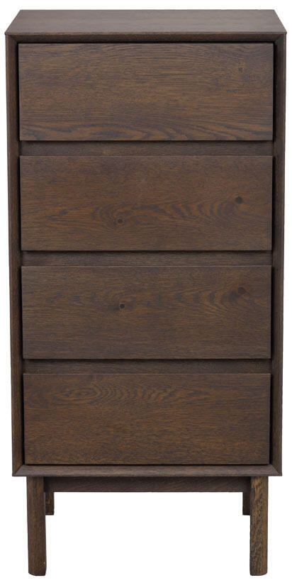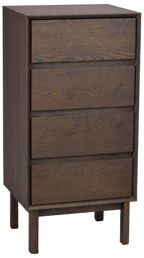 Byrån Mackay i brun vildek med 4 lådor är ett gediget hantverk med girade hörn och en inramning runt lådorna som skapar ett djup och ett härligt skuggspel på möbeln. Byrån har en klassisk design med sina raka linjer, vilket gör den hållbar över tid. Passar lika bra i hallen som i sovrummet. Vildeken som byrån är tillverkad i bidrar till en intressant karaktär i möbelns yta. Trät i byrån är FSC®-certifierat och finns i alternativen oljad vildek och brunojad vildek. Mackay finns i tre olika storlekar, du hittar övriga två en bit ned på sidan under Liknande produkter.