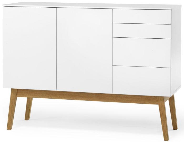 I serien Mood hittas två skänkar, det här är en större med ett dörrpar och fyra lådor i olika storlekar för praktisk och anpassningsbara förvaring. Bakom dörrarna döljer sig ett flyttbart hyllplan. Förvaringsmöbeln har en nätt design med fina linjer och en omtyckt blandning av vitt och ek. Sideboardet passar in såväl i köket, hallen, sovrummet som vardagsrummet.