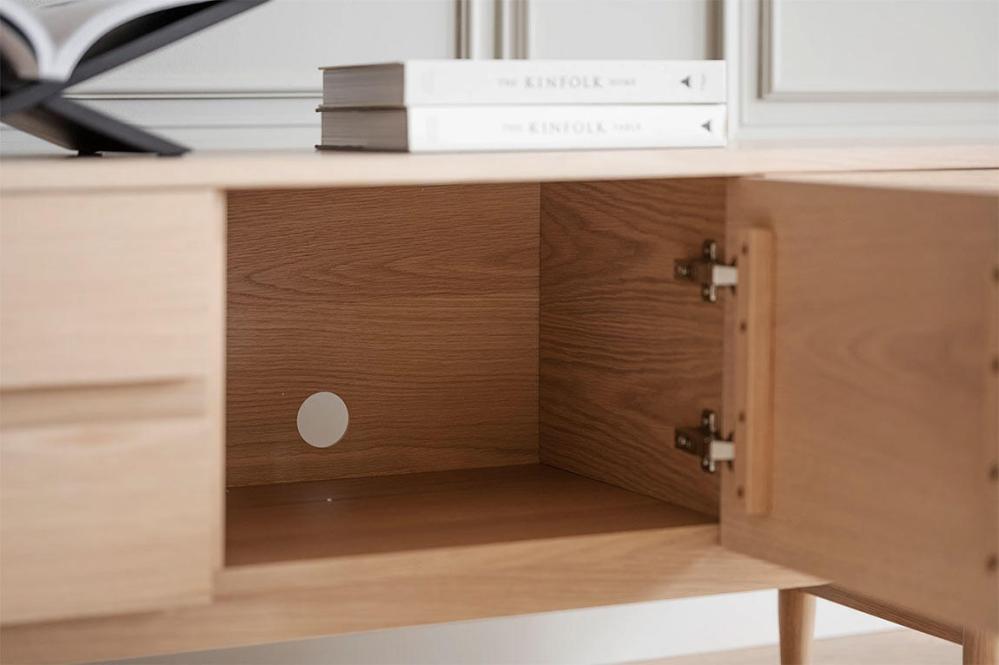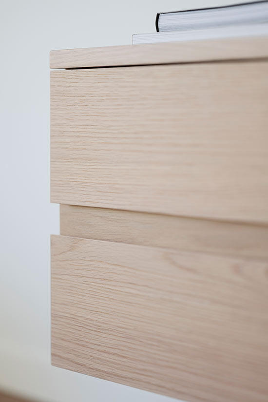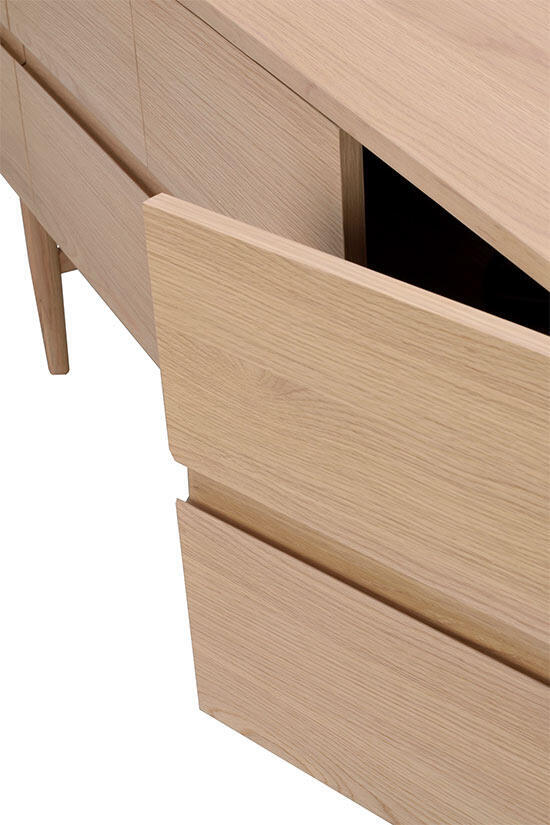 Ekfaner på MDF, massiv ek i detaljer på dörrar, samt i ben och sarg