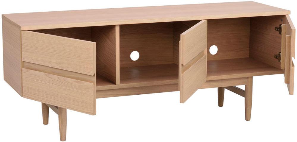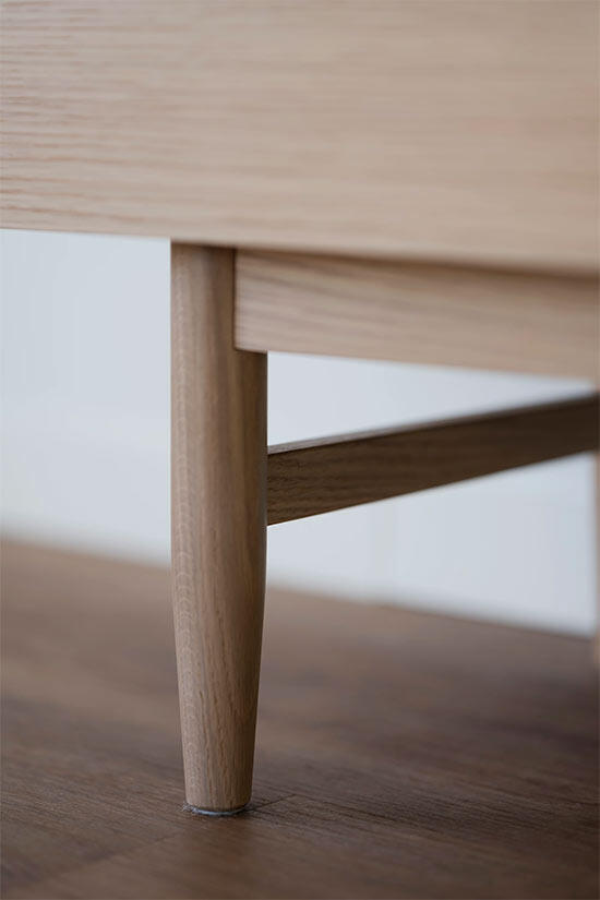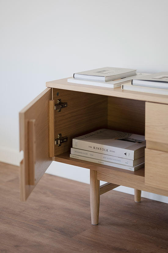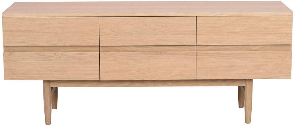Eleganta Moresby tv-bänk passar både det moderna och mer traditionella hemmet och utgör ett stilsäkert blickfång. Den höga formsvarvade benställningen av massiv ek skapar ett harmoniskt och luftigt uttryck. Moresby mediabänk har tre mjukstängande dörrar.