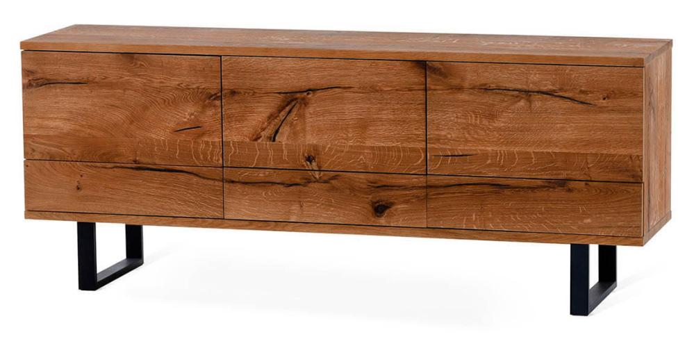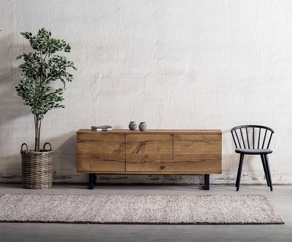 Narvik är ett rustikt bufféskåp med 3 dörrar och 3 lådor i oljad vildek.