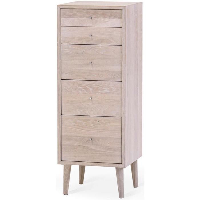 I serien Nordik hittas tre modeller av byråar, alla med fin design och praktiska lådor med mjukstängande beslag. Det här är den mellersta storleken med fem lådor på höjden som passar väl in i hallen som sovrummet.
