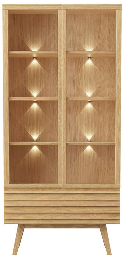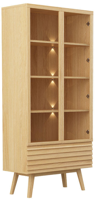 Vitrinskåpet är utformat med två stora glasdörrar som kan öppnas med ett tryck. Under dessa finns en trälåda med träbearbetning som skapar jalusieffekten. Bakom dörrarna finns tre trähyllor som alla är justerbara och förberedda för belysning, även om belysning inte ingår (kan enkelt läggas till här på produktsidan).