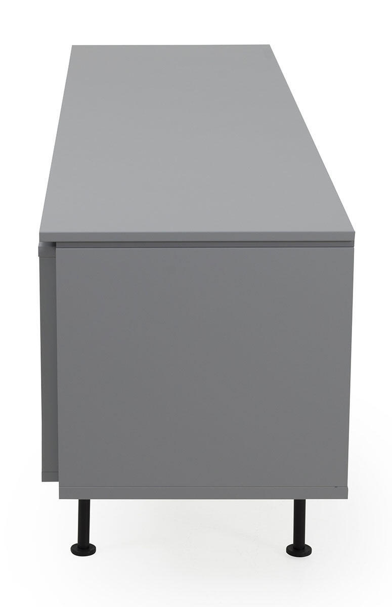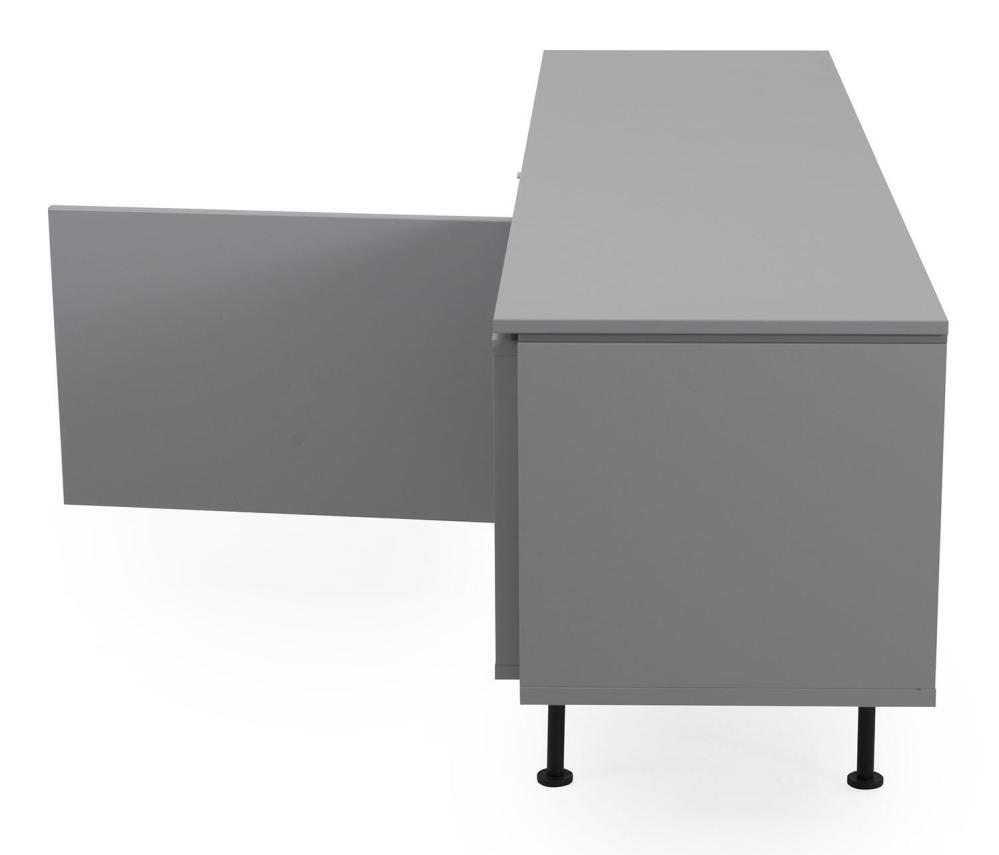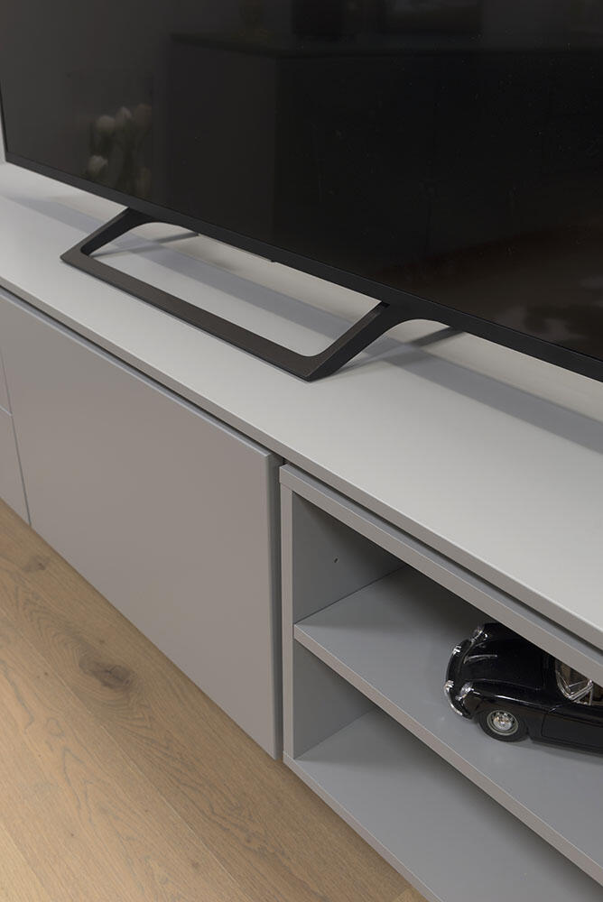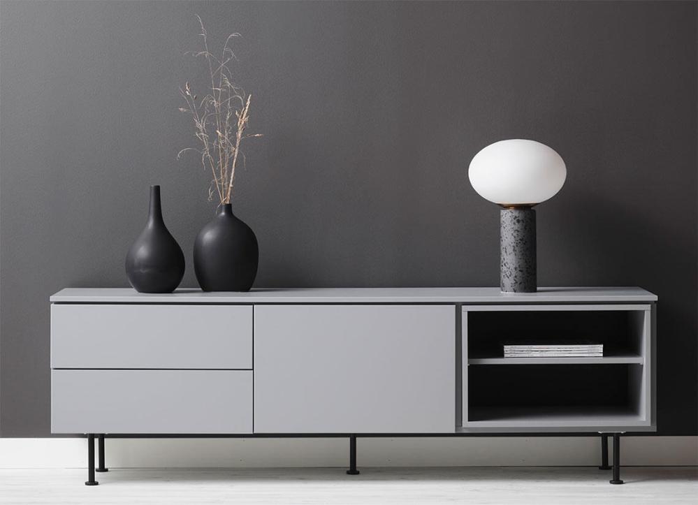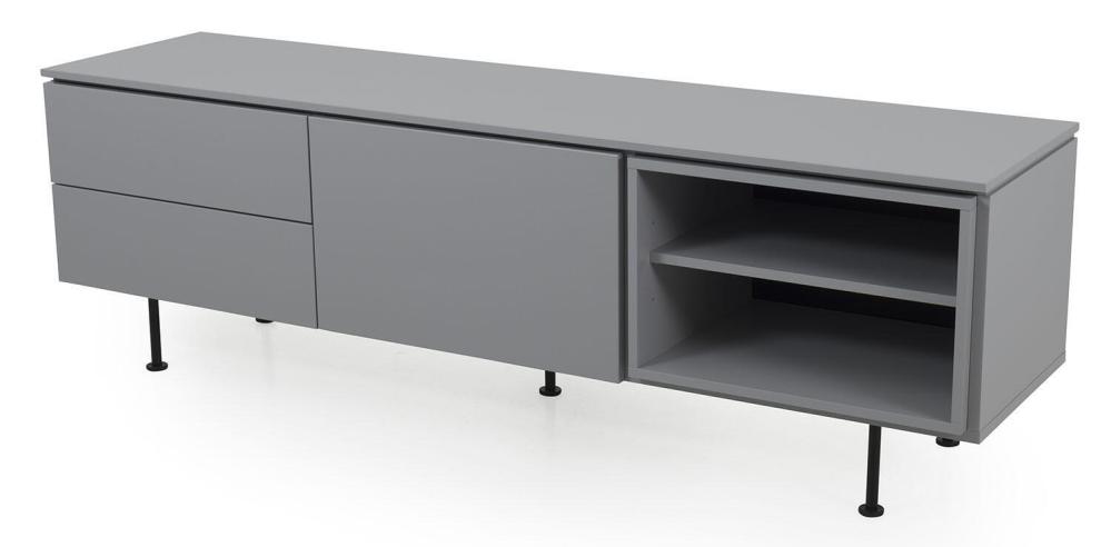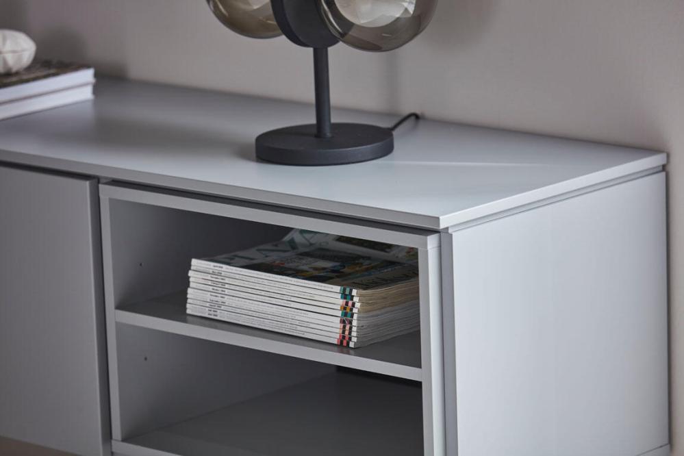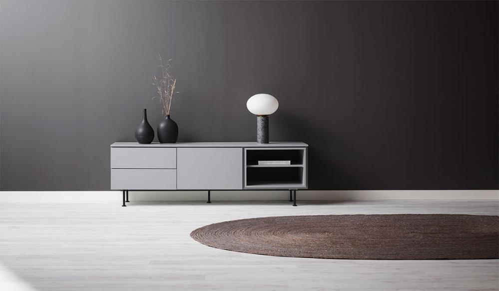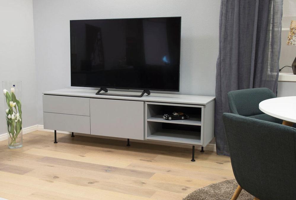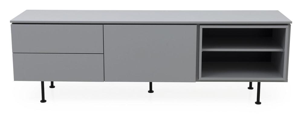 Plain TV-bänk med en dörr och två lådor som har smart push-up-funktion samt en kub med ett fast hyllplan. Denna modell är helt lackad i grått, svart, vitt eller mossgrönt. Lägg märke till att dörr som lådinsats och kub är flyttbara och kan monteras där du önskar.