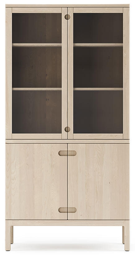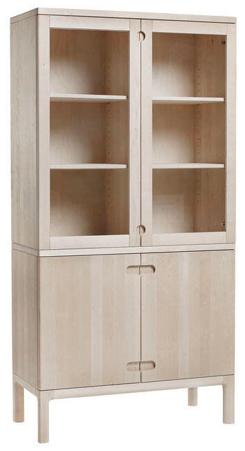 Den här modellen av förvaringsmöbeln heter "Prio vitrin Björk". Vitrinskåpet levereras med två glasdörrar och två trädörrar av massiv trä. Hyllplanen i överskåpet kan väljas i trä eller glas, vid val av glashyllor ingår belysning. Den förmonterade belysningen består av två stycken LED-spotlights.