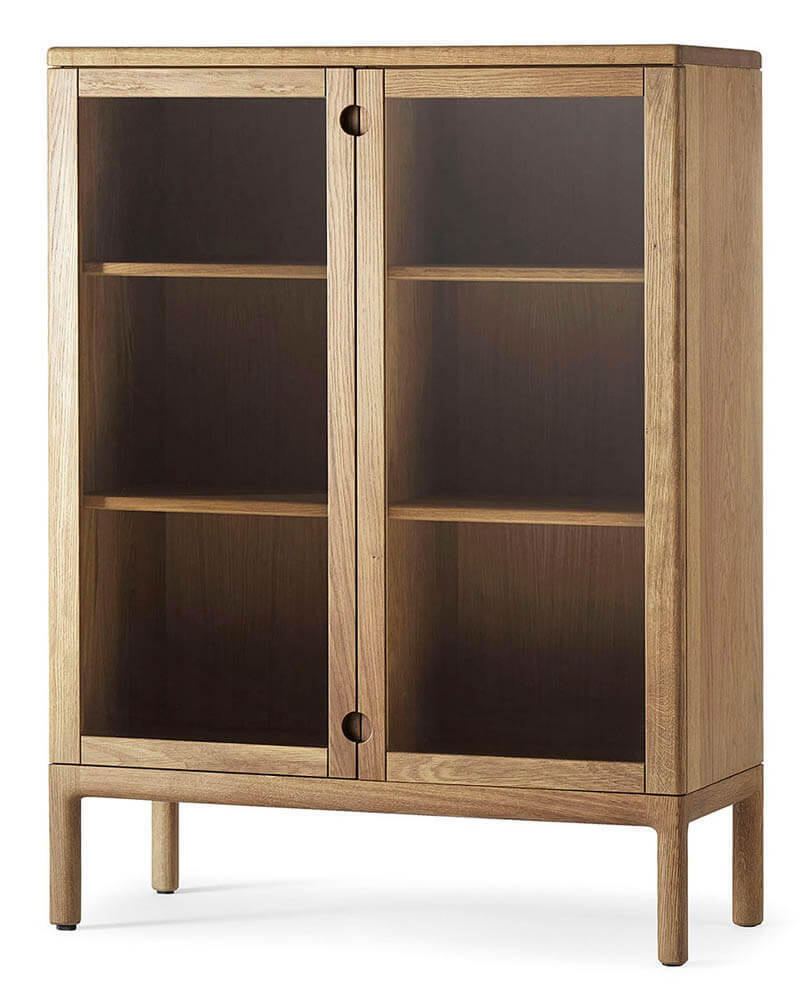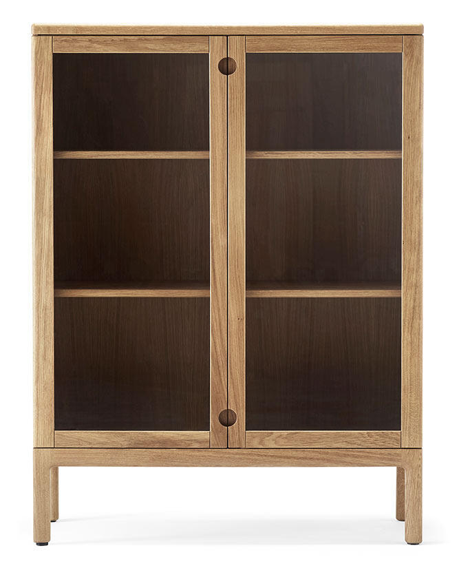 Den här modellen av förvaringsmöbeln heter "Prio skåp hög H120 cm Ek". De två dörrarna kan väljas i massiv trä alternativt glas. Lägg märke till att handtagen skiljer sig beroende på val av trädörrar eller glasdörrar.