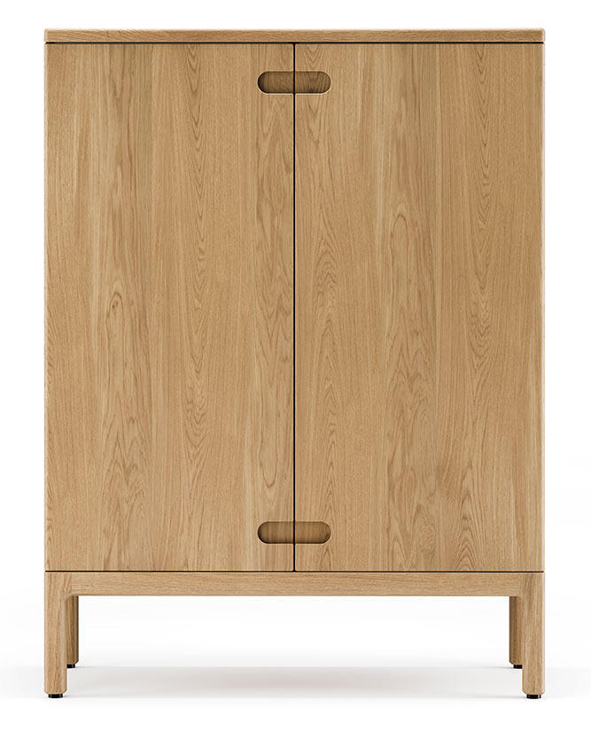 Den här modellen av förvaringsmöbeln heter "Prio skåp hög H120 cm Ek". De två dörrarna kan väljas i massiv trä alternativt glas. Lägg märke till att handtagen skiljer sig beroende på val av trädörrar eller glasdörrar.