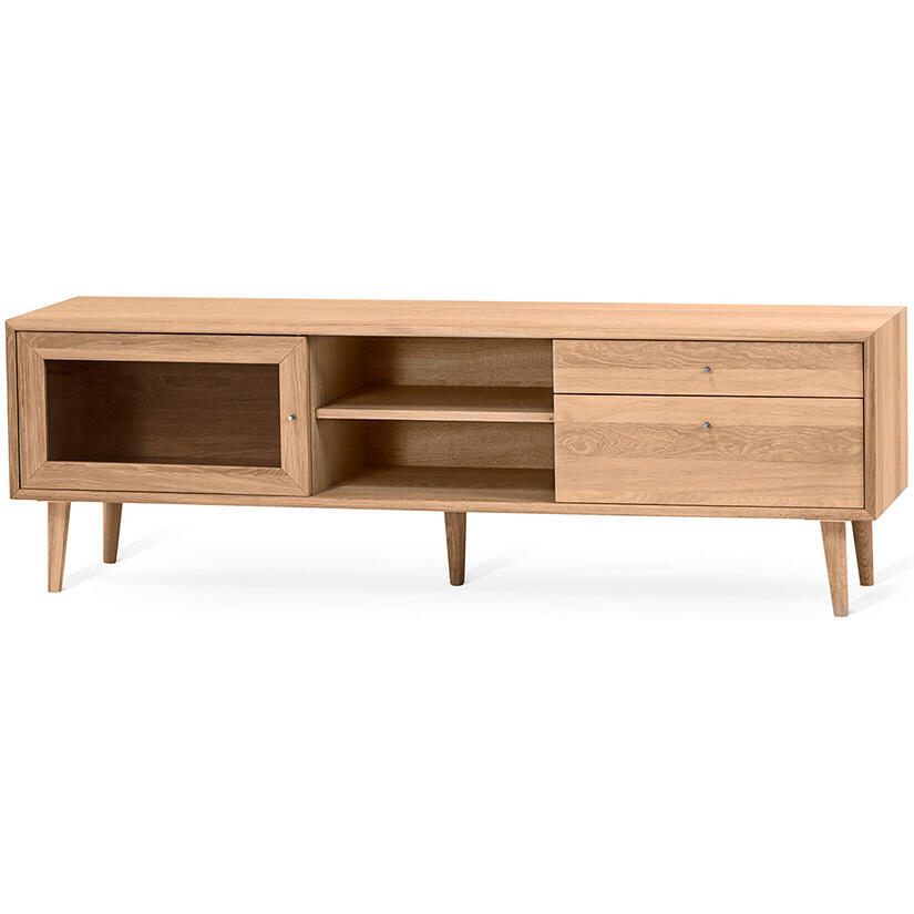 I serien Scandi hittas tre storlekar av TV-bänkar, det här är den mellersta modellen på 160 cm som har en glasdörr där fjärrkontrollens signaler enkelt går igenom, ett öppet fack med en justerbar hylla och två lådor i olika höjder. En behändig mediabänk som passar de flesta vardagsrummen samtidigt som den ger rymlig förvaring.