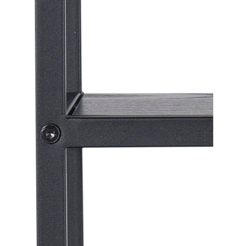 Seaford är en bred möbelserie med bland annat denna snygga assymetriska vägghyllan med en snygg kombination av vildek alternativt svart melamin och pulverlackad mattsvart metall.