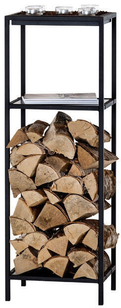 Den här modellen som du kollar på just nu är en av de mindre hyllorna i serien Steel, den är 110 cm hög och finns både i vit och svart. Hyllan som med fördel kan placeras i såväl badrummet, köket som vardagsrummet har tre plan. Modellen gör sig väldigt bra med tre hyllplan eller med höga som låga lådor. På bild kan hyllan ses med en låg metallhylla på toppen och rejäl plats för ved på den nedersta hyllan. Komplettera gärna med svarta hjul för att få en än mer praktisk och flyttbar möbel.