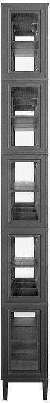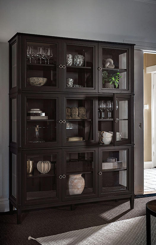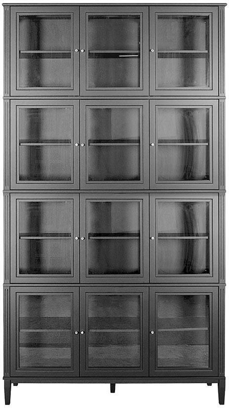 En del av serien är detta stapelbara vitrinskåp som kan beställas med 1, 2, 3 eller 4 sektioner. Den här artikeln är vitrinskåpet med 4-sektioner, det vill säga fyra våningar. Förvaringsmöbeln levereras med totalt tolv glasdörrar med en trähylla bakom varje dörr och skåpet har sidor av glas. Toppskiva och benställning medföljer.