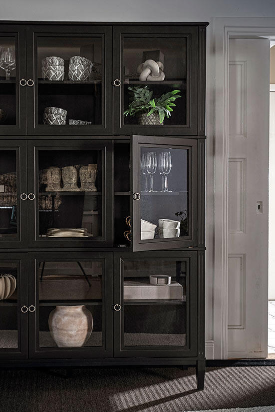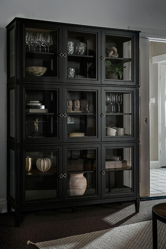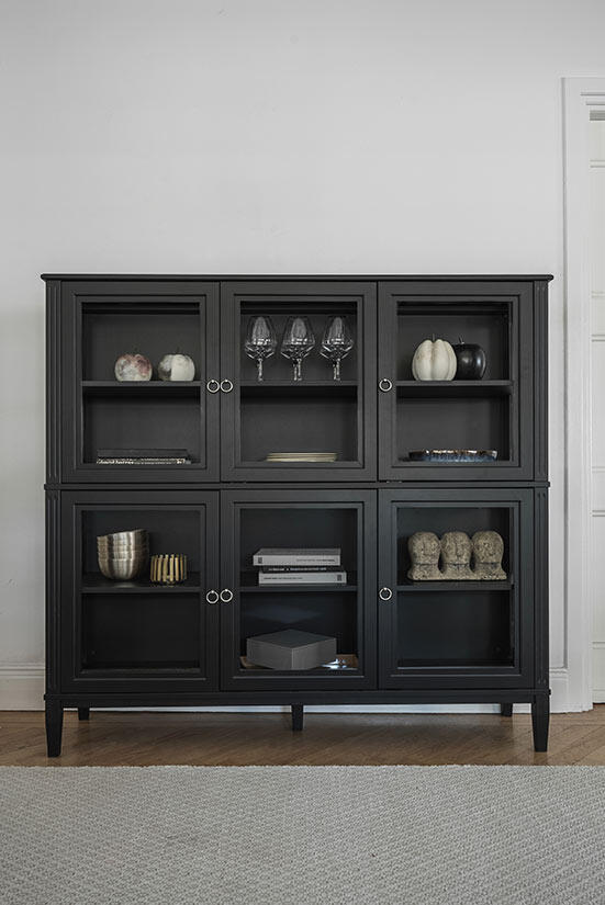 Vitrinskåpet ger en chans att visa upp exempelvis den fina servisen eller de vackra vinglasen och snygga inredningsdetaljerna i hemmet. Vitrinet tillverkas av FSC-certifierad massiv furu med miljövänlig MDF. Möbeln har sedan handmålats för hand i svart, grå eller vit.