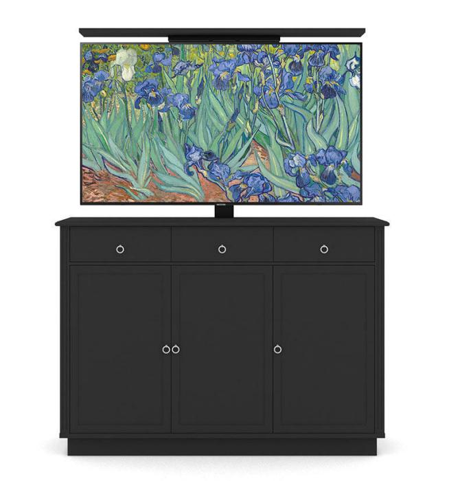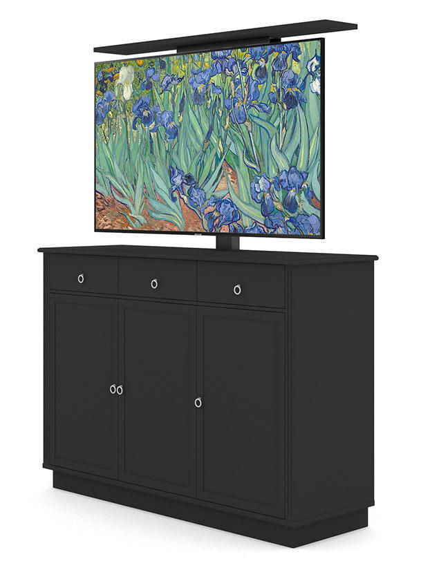 Den motoriserade TV-liften använder sig av VESA standardfästen för enkel montering av din TV på två metallskenor. Den övre delen av skänken har en nedfällbar lucka där du kan placera din soundbar. När den är stängd så ser det ut som vanliga lådor. Trots att möbeln huserar en hel tv så finns gott om förvaring bakom de tre dörrarna med 16 cm djupa hyllor som är justerbara i höjd. Dörrarna är uppdelade med en enkeldörr och en dubbeldörr. Skänken har gömda hål för kablar.