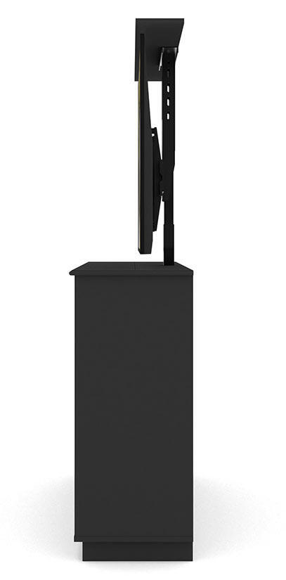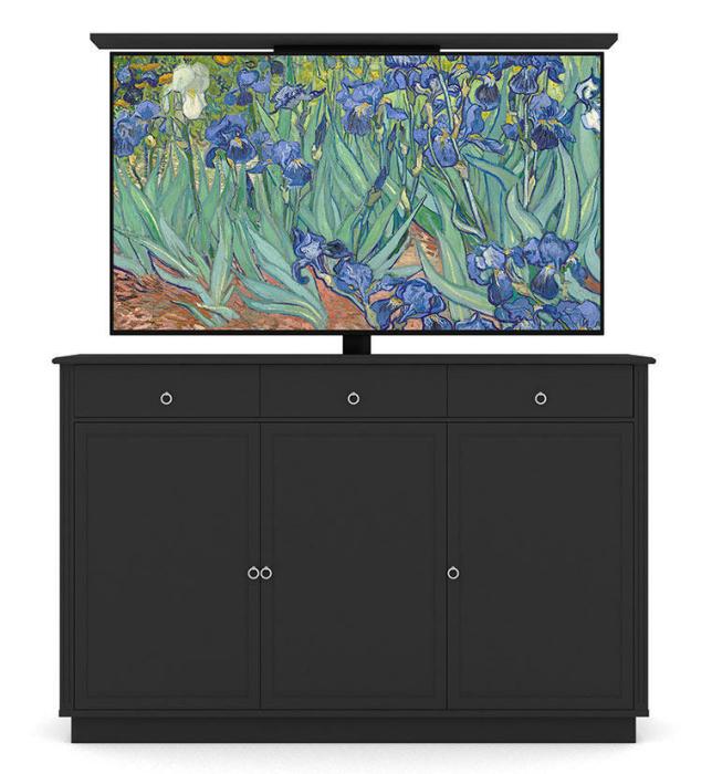 Den motoriserade TV-liften använder sig av VESA standardfästen för enkel montering av din TV på två metallskenor. Den övre delen av skänken har en nedfällbar lucka där du kan placera din soundbar. När den är stängd så ser det ut som vanliga lådor. Trots att möbeln huserar en hel tv så finns gott om förvaring bakom de tre dörrarna med 16 cm djupa hyllor som är justerbara i höjd. Dörrarna är uppdelade med en enkeldörr och en dubbeldörr. Skänken har gömda hål för kablar.