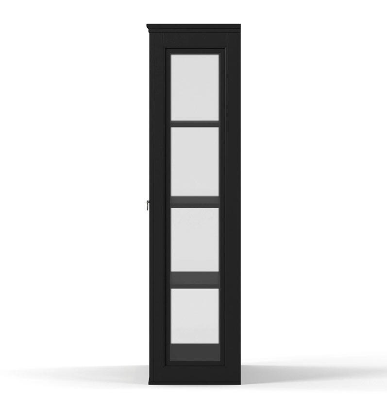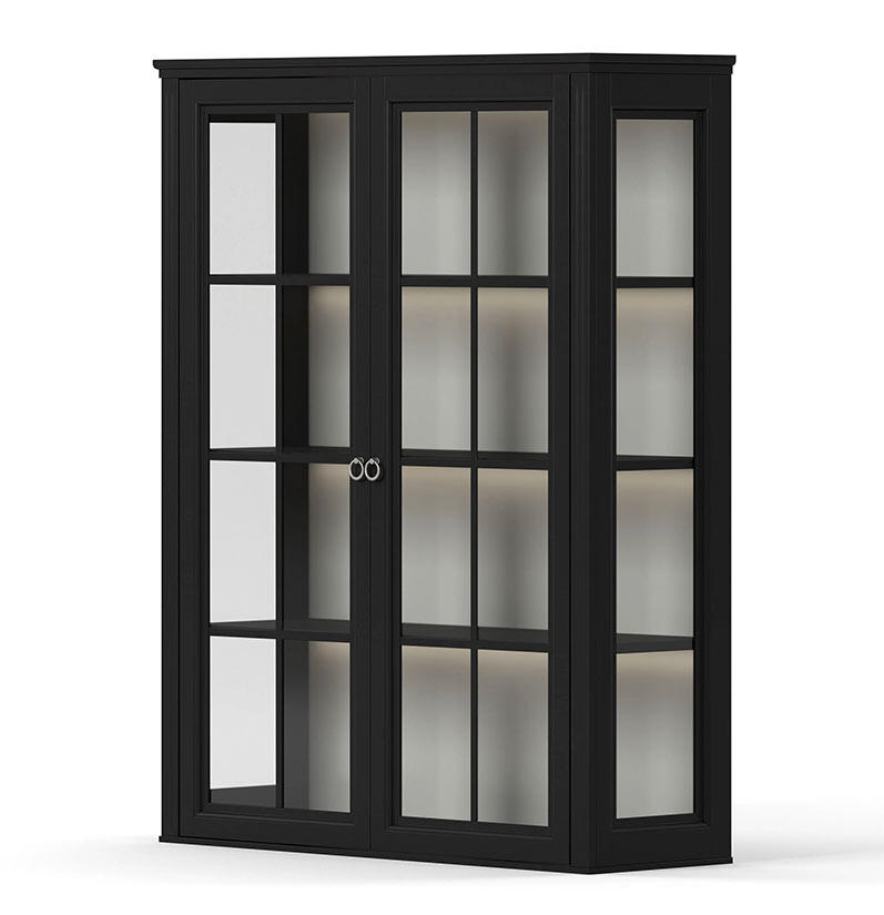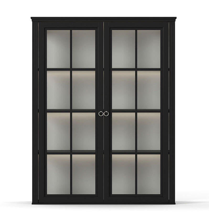 Skänken/underskåpet med två dörrar och lådor kombineras här med det matchande överskåpet som har två glasdörrar och sidor av glas, för en chans att visa upp exempelvis den fina servisen eller de vackra vinglasen. Skänkvitrinet tillverkas av FSC-certifierad massiv furu med miljövänlig MDF. Möbeln har sedan handmålats för hand i svart, grå eller vit.
