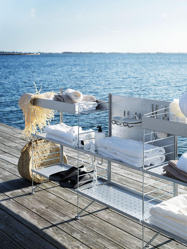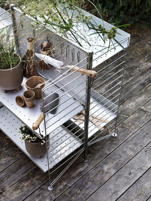 Den fristående utomhushyllan i galvaniserat material från String® System passar lika bra på en mindre balkong som till en större terrass. Hyllan är fristående men går att fästa i underlaget om så önskas. Utomhushyllan är framtagen för alla balkongägare eller husägare som inte vill borra i fasaden eller träplanket. Den fristående galvaniserade hyllan är robust och stannar gärna utomhus året runt.