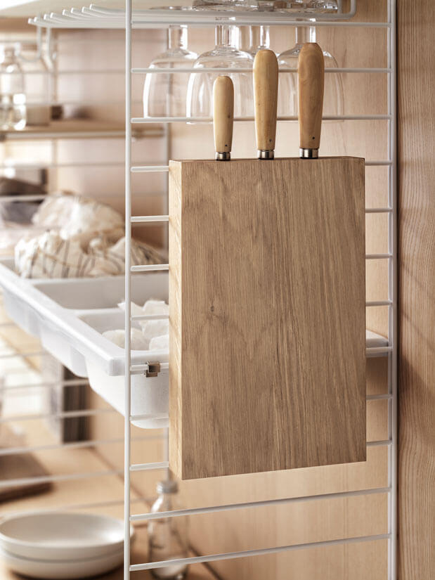 Ett av de senaste tillskotten till Strings utbud av accessoarer är ett knivblock. Det kommer att hålla dina knivar i både bra skick och på ett och samma ställe. Knivblocket hängs enkelt på en utav gavlarna på din String® kombination.