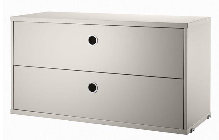 String lådhurts med två lådor, försedda med samma runda handtag som luckorna till skåpen. Hyllplan och hyllbärare ingår och skåpet passar till 30 djupa gavlar.