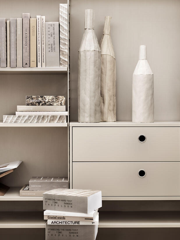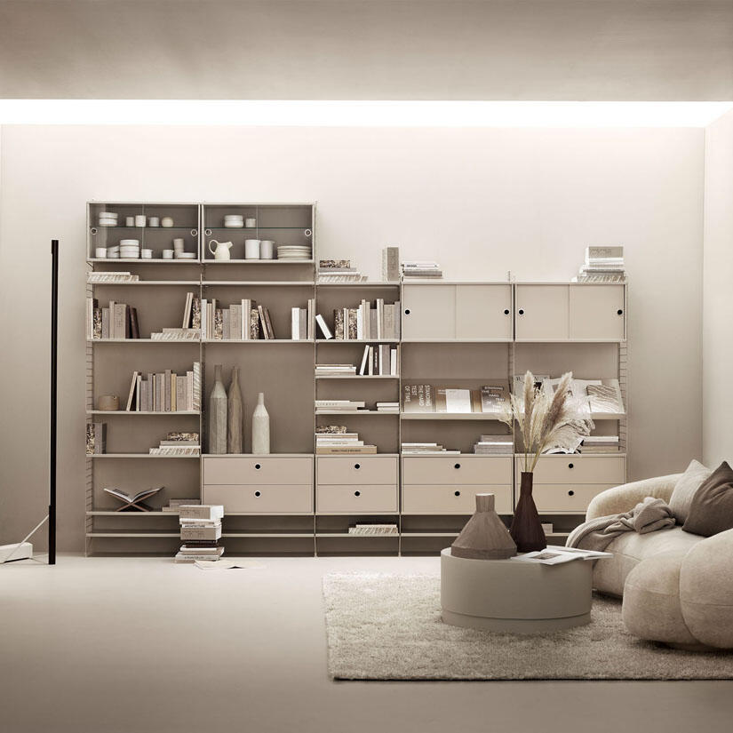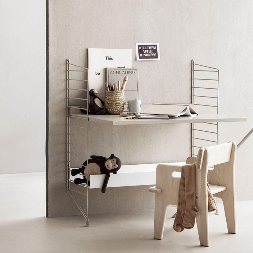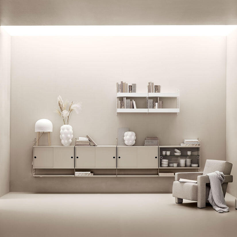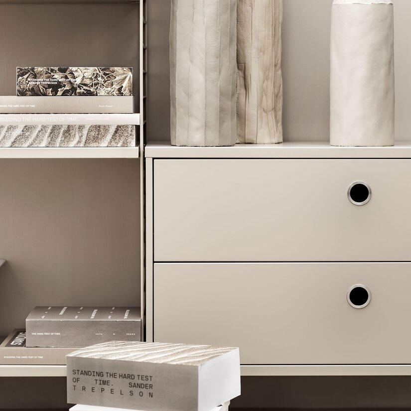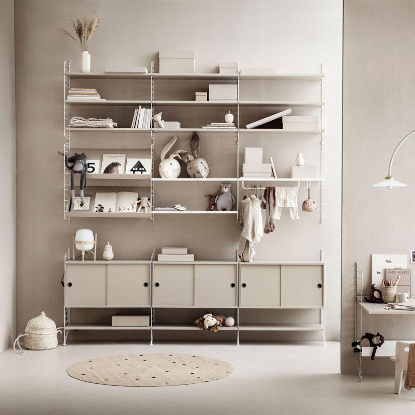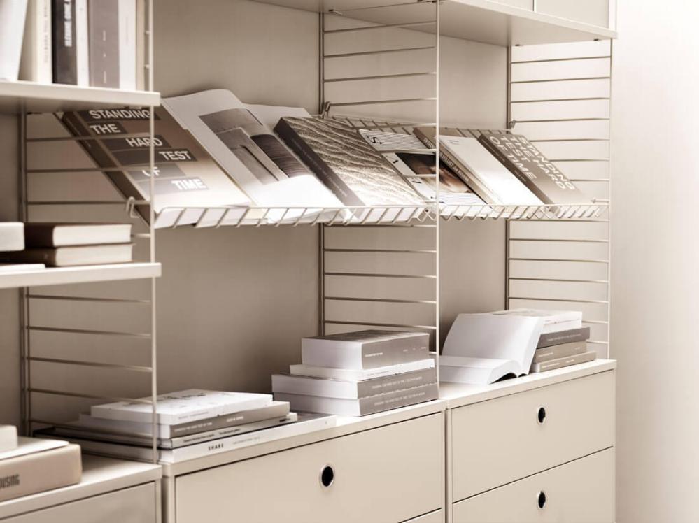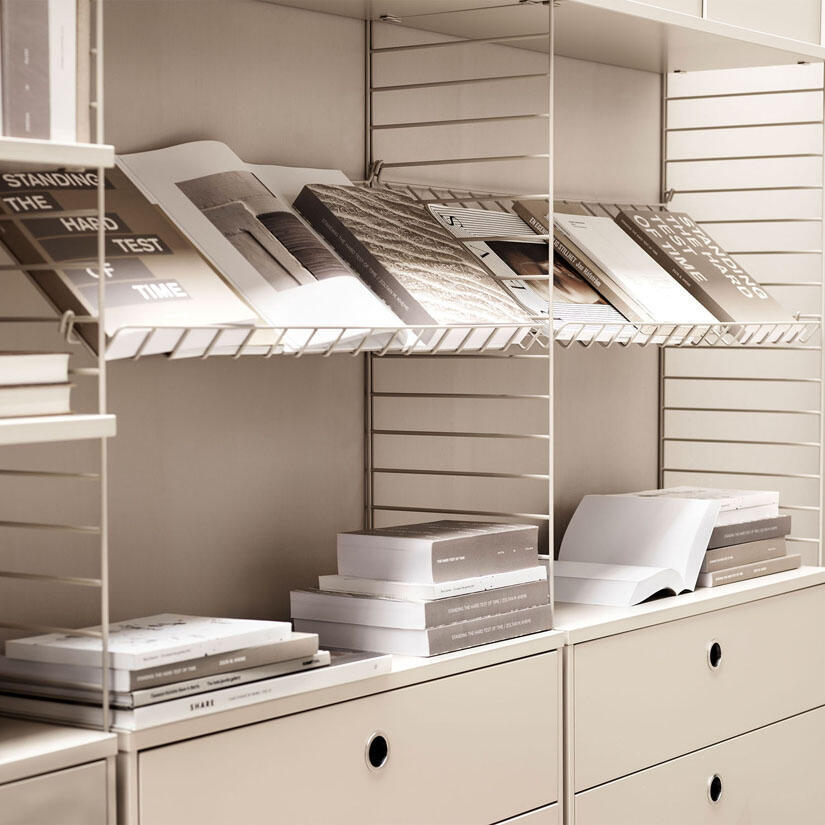 Lådhurtsen kan enkelt integreras i String®-hyllsystemet i några få steg. Lådhurtsen finns i två bredder, 58 och 78 cm, och ett djup, 30 cm.