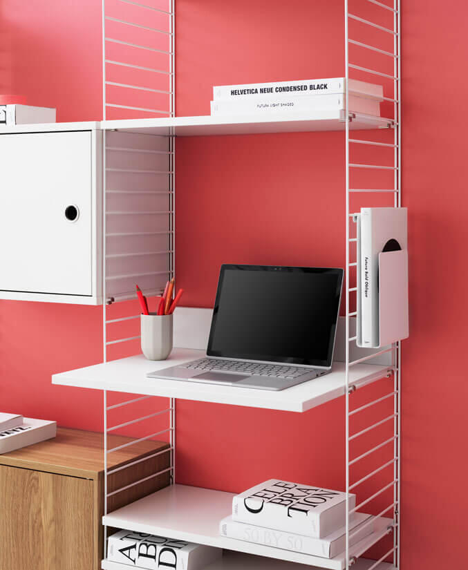 Mediahyllplanet finns i en storlek, b58 x d47 x h10 cm, och passar med trådgavlar från String® System med djup 30 cm. Mediahyllplanet är framtaget för att ge vinylspelaren en given plats i hemmet. Hyllplanet är designat för att få plats med sladdar mellan hyllplanet och väggen utan att de kläms. Mediahyllplanet kan också användas som en arbetsplats eller varför inte ett drinkbord. Hyllan av lackad MDF har en finstruktur vilket gör att det får en fin kontrast mot övriga delar i serien.
