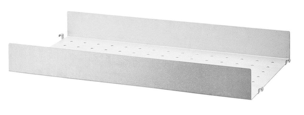 Metallhyllplan 58 cm med hög kant på 7 cm, kanten är både fram och bak. Nu går det tidlösa hyllsystemet även att använda för elegant och funktionell förvaring utomhus, i och med att String lanserar en galvaniserad version av hyllsystemet. Hyllplanen är tillverkade i materialet aluzink, som är en stålplåt belagd med aluminium-zink som står emot väta och rost. Gavlarna är tillverkade av stål som ytbehandlats genom varmförzinkning. Kombinera ihop din egen String kombination för utomhusbruk!
