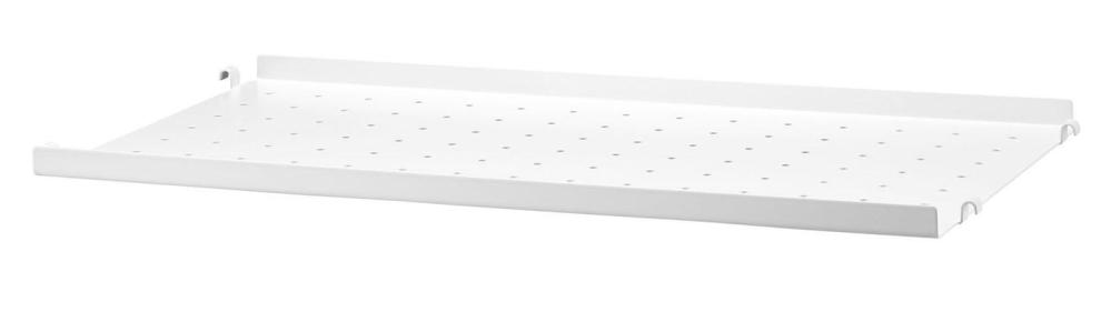 Metallhyllplan 58 cm med låg kant på 2 cm, kanten är både fram och bak. Välj bland fyra färger: vit, svart och grå samt i galvaniserat stål för utomhusbruk (egen artikel). Hyllplan i metall är ett av de nyare tillskotten till Stringhyllan, metallhyllplanen används som mest i hallkombinationer och där man vill ha en yta som är lättare att torka av. Metallhyllplanet är anpassat för att man ska kunna använda sig av krokar och spjut för att bygga på förvaringen! Denna modell passar gavlar med 30 cm djup.