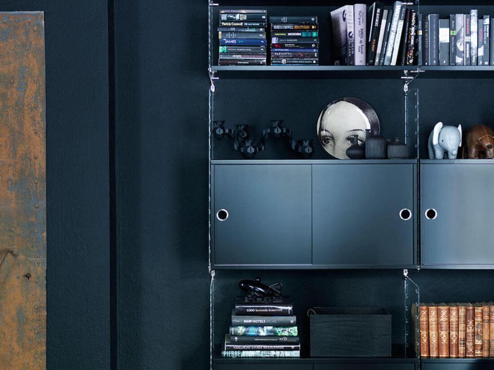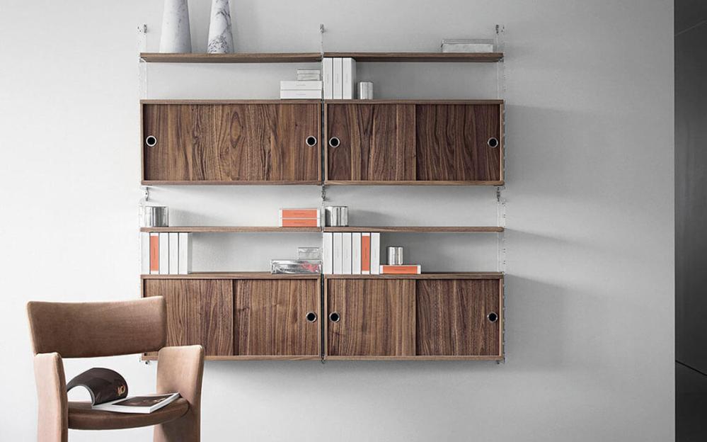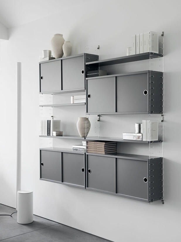 String® Plex som skapades 1954 har gavlar av laserskuret plexiglas som ger ett intryck av fritt svävande hyllplan. String® Plex finns i två höjder, 50 och 75 cm, och två djup, 20 och 30 cm.