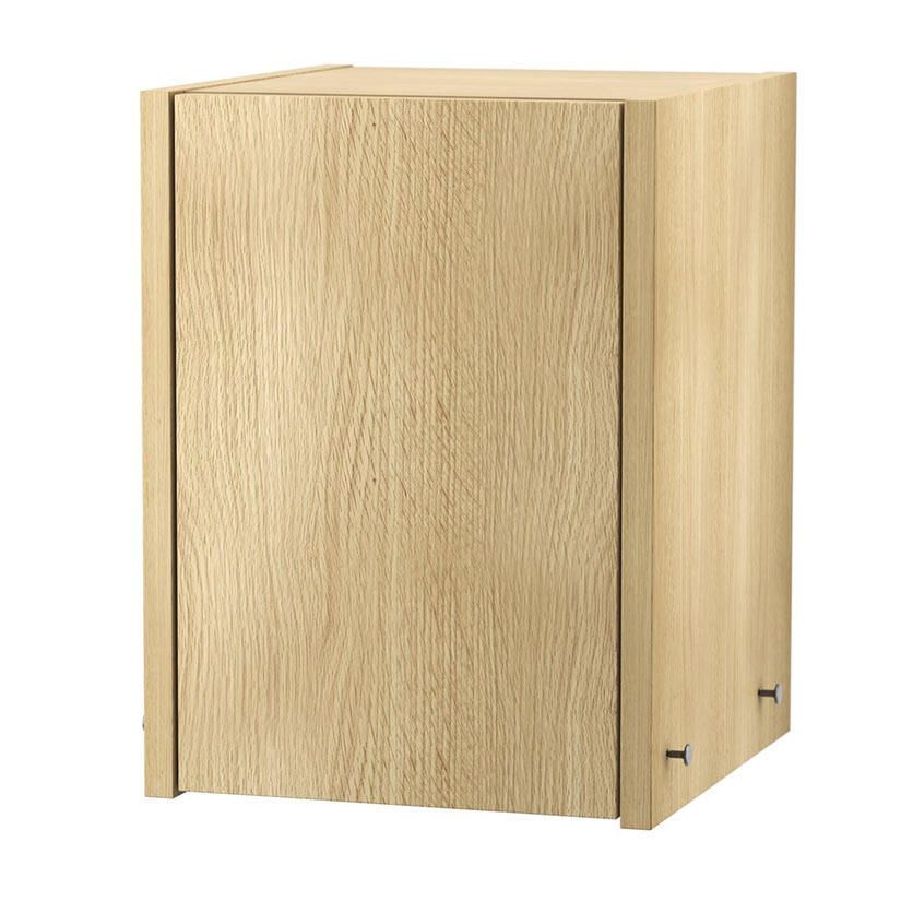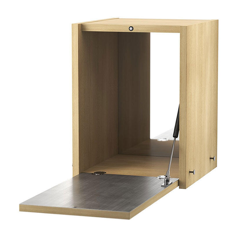 Vägghängd vardagsrumshylla i ek eller valnöt med ett snapsskåp integrerat. En blandning av hyllplan och lådor är den optimala kombinationen för ett vardagsrum. Hyllan förvarar dina böcker och andra mindre ting samtidigt som lådorna tar hand om alla småsaker du inte vill ska vara synliga.