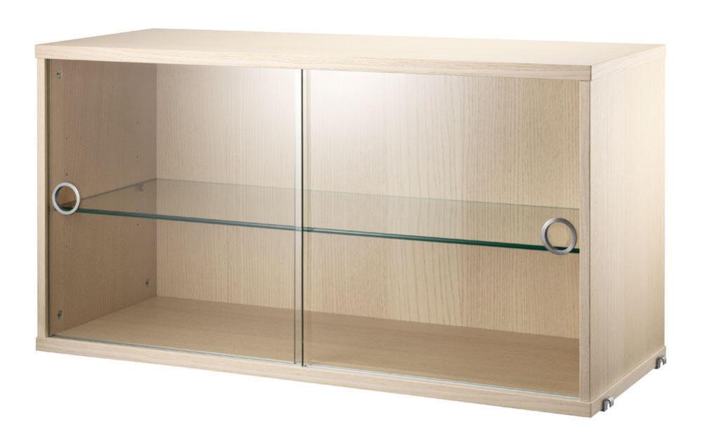Vitrinskåpet med skjutdörrar kan enkelt integreras i String®-hyllsystemet i några få steg. Vitrinskåpet finns i en bredd, 78 cm, och ett djup, 30 cm.