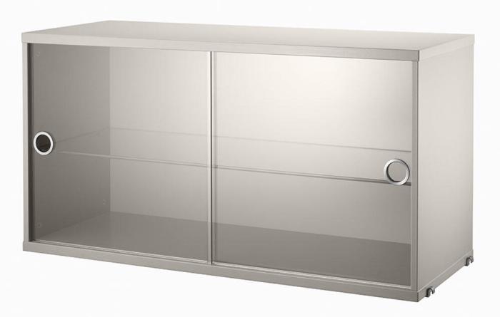 Vitrinskåpet med skjutdörrar kan enkelt integreras i String®-hyllsystemet i några få steg. Vitrinskåpet finns i en bredd, 78 cm, och ett djup, 30 cm.