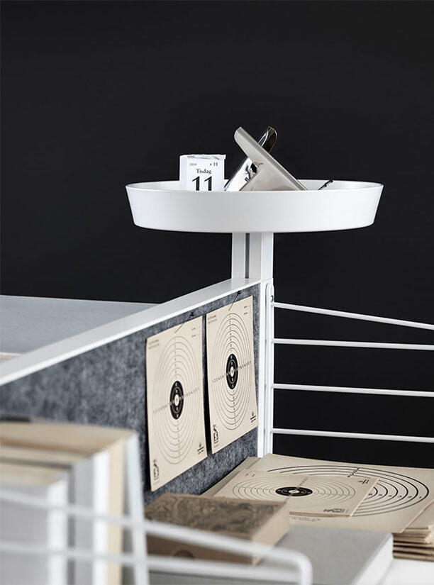 Den fristående Works™-hyllan med skiljevägg i filt reducerar ljudnivån och integreras enkelt i String® System och Works ..by String Furniture.