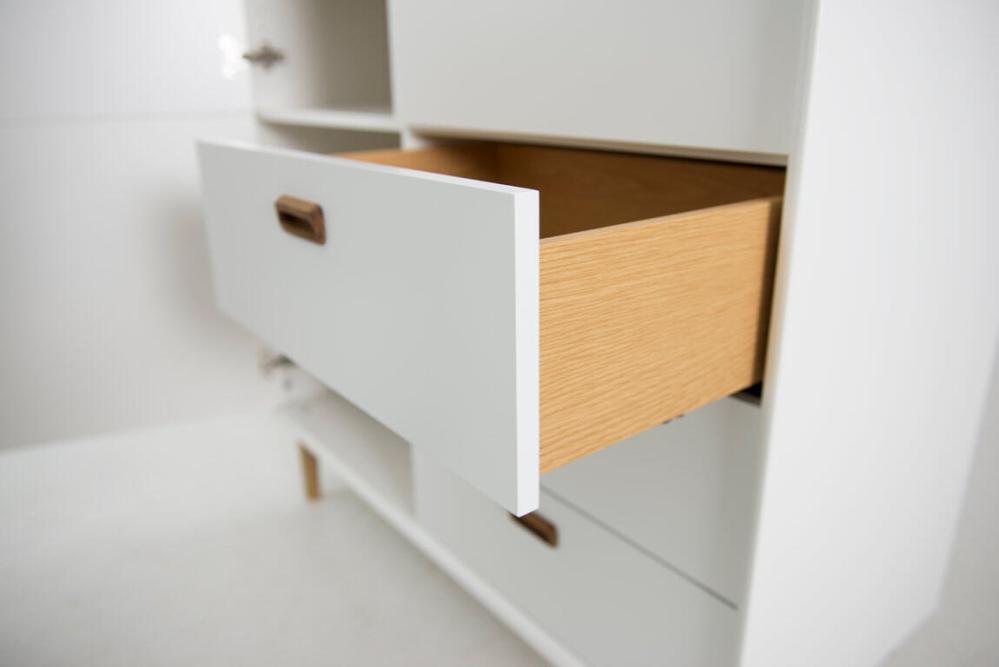 Svea är tillverkad av vitlackad MDF med underrede och handtag av massiv oljad ek. Dörrar och lådor har mjukstängande funktion vilket ger en behaglig daglig användning.