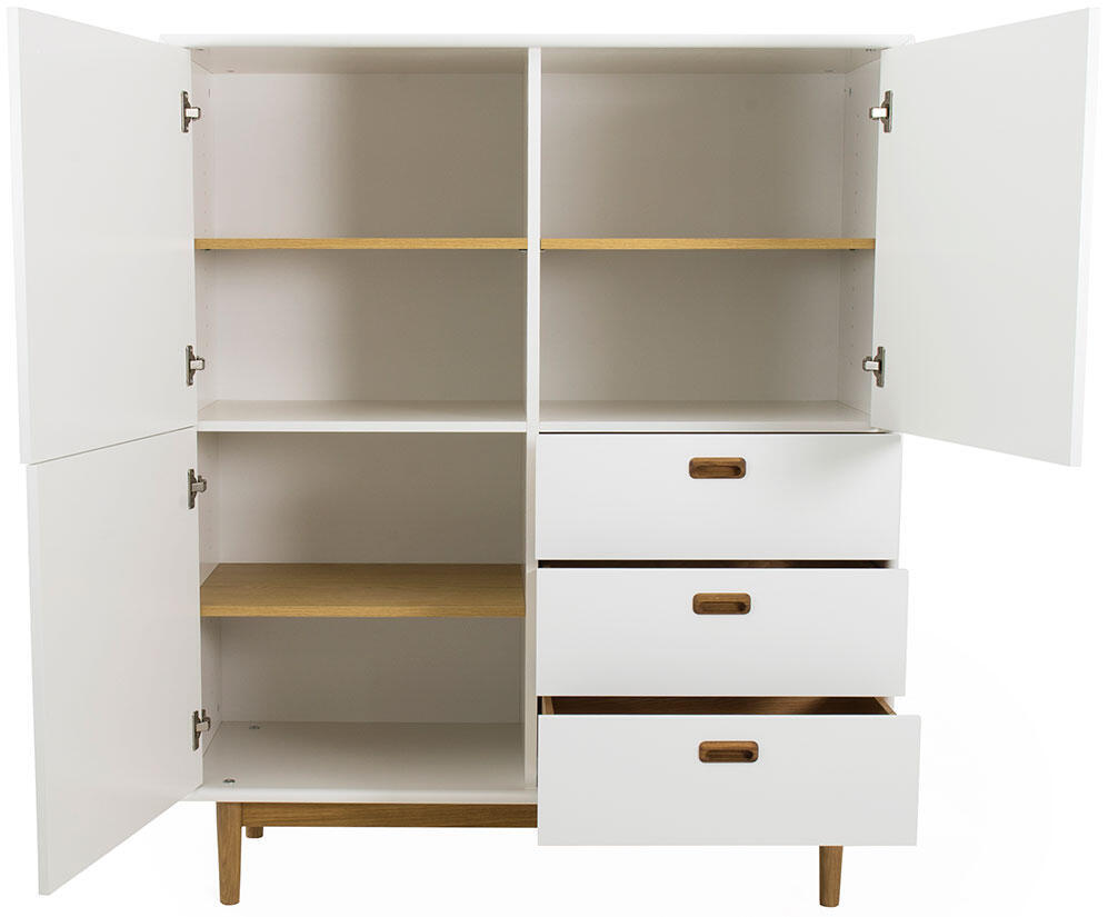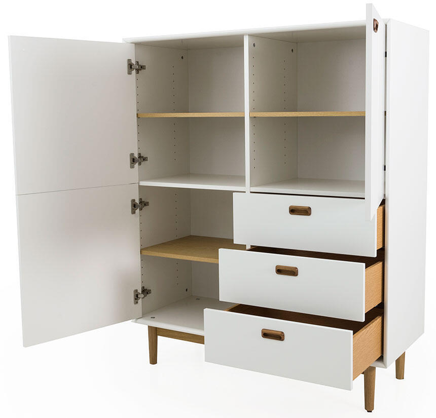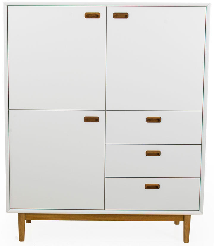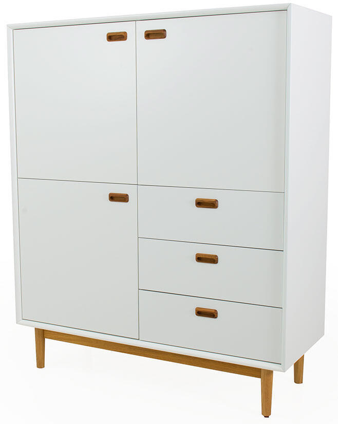 Skåpet Svea är ett praktisk och elegant skåp från Tenzo. Förvaringsmöbeln har en bas av vitlack eller mossgrön, med massiva ekdetaljer på såväl underredet som de infrästa handtagen får du en stilren möbel som passar in på många platser. Med tre dörrar och ett varsitt justerbart hyllplan och tre lådor finns det gott om plats för förvaring. Önskar du ett lägre sideboard eller en annan typ av möbel finner du andra modeller ur samma möbelserie en bit ner på sidan under Liknande produkter.