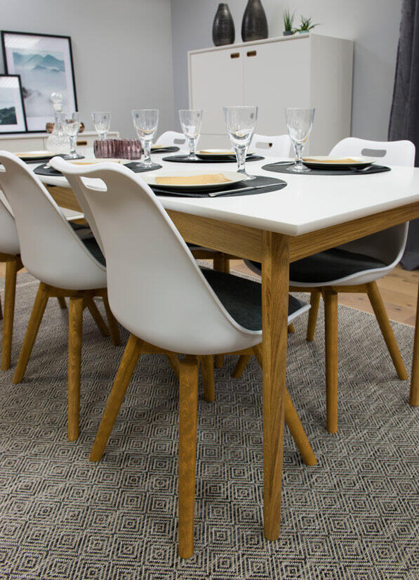 Det stora matbordet i serien Svea är den naturliga samlingsplatsen för hela familjen. Det utdragbara bordet är av butterfly-modell, vilket innebär att det bara tar några sekunder att fälla ut det från 195 till 275 cm. Att ta hem extra vänner till middagen kommer aldrig mer att bli ett problem! Matcha bordet med valfria stolar, kanske en av Tenzo's snygga modeller?