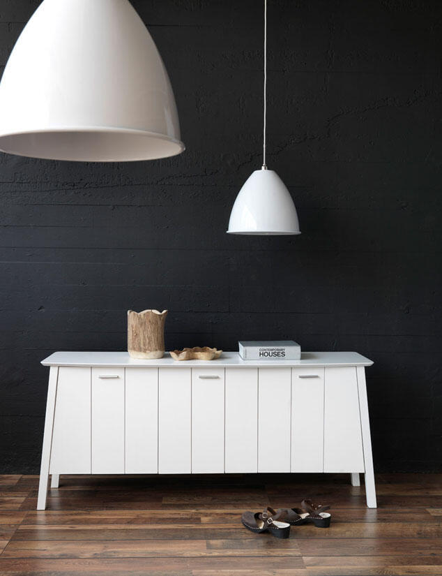 Verona sideboard har en framsida med tre skåpdörrar. Handtagen har en sober och elegant design som är gjorda av borstad stål. Skåpet är uppdelat i tre sektioner med vardera ett hyllplan. Den gedigna möbeln som med sin avskalade och stilrena design passar i många rum och hem.