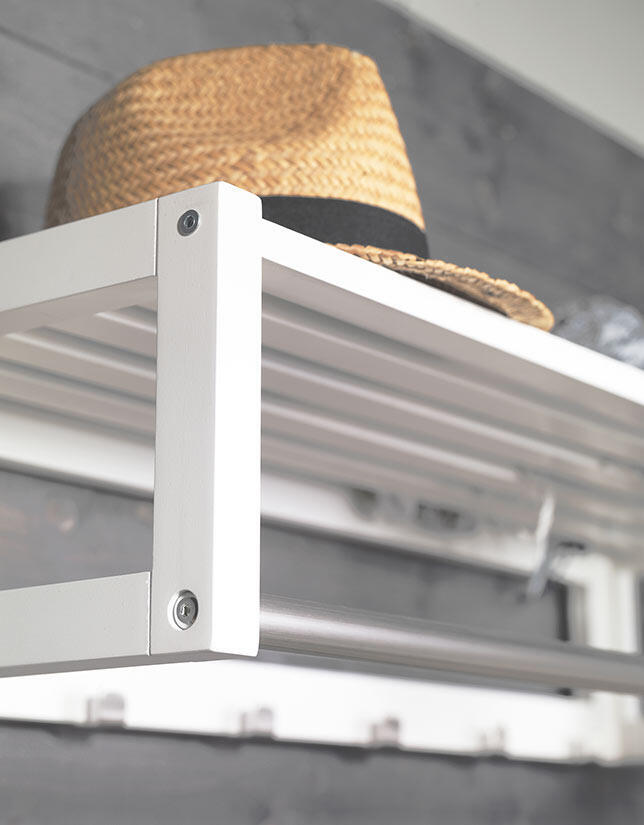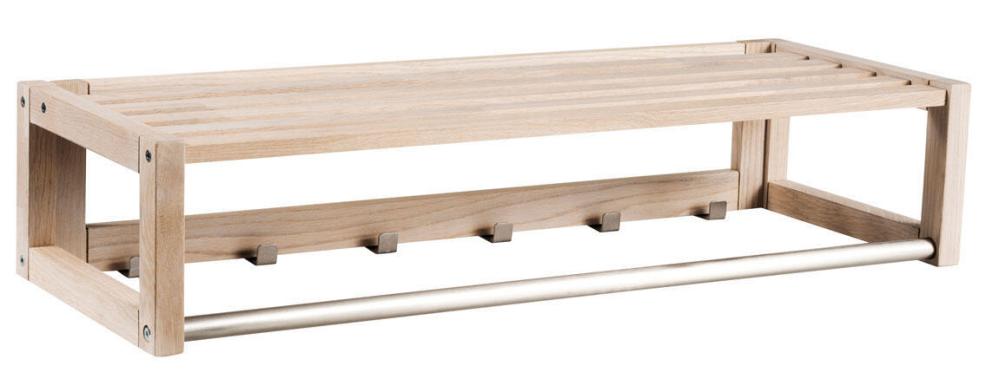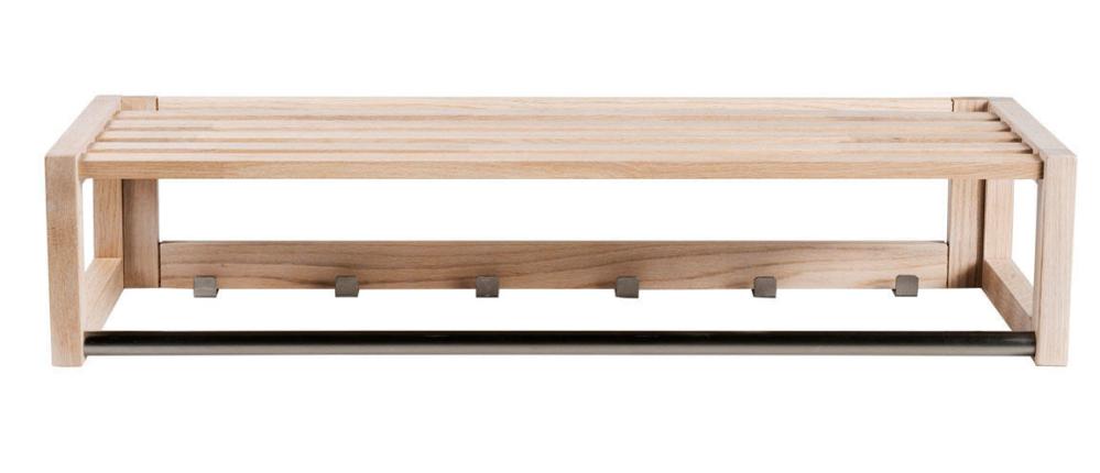 Confetti hatthylla i massiv ek. Hatthyllan är både praktisk och modern med snygga krokar i metall. Hatthyllan ingår i hallserien Confetti från svenska varumärket Rowico Home.