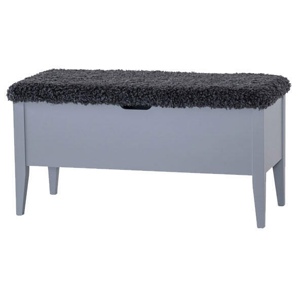 Hallbänken är tillverkad i en blandning av massiv björk och MDF i grålack. Stommen kombineras med valbar klädsel i grå äkta fårskinn, grå fårskinnslook, mörkgrått ulltyg eller grått Chelsea tyg. Klinte bänken finns i flera färger samt i storlek 45 och 160 cm.