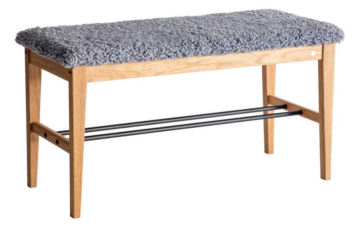 Hallbänken finns i flera ytbehandlingar med valfri färg på äkta fårskinnsdyna eller fårskinnslook. Hyllan under bänken ger möjlighet till skoförvaring.
